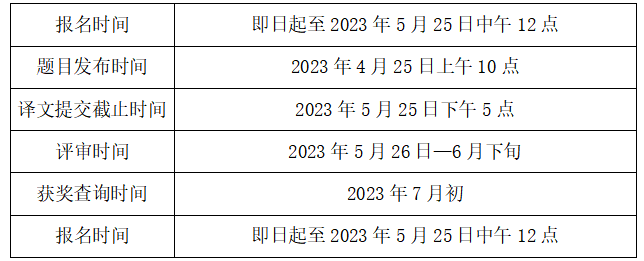 报名时间:即日起至2023年5月25日中午12点 报名通道 (识别二维码可进入报名) 一、大赛背景 为深入贯彻落实教育部《关于加快建设高水平本科教育全面提高人才培养能力的意见》等文件精神,助推高校英语教学技法革新,激发大学生学习英语的热情,在圆满举办创研杯全国大学生英语词汇能力挑战赛后,获得众多院校老师及同学的大力支持,经研究,决定举办创研杯全国大学生英语翻译竞赛。 二、主办单位 空中英语教室杂志社 黑龙江省创新教育研究院 创研杯全国大学生英语系列赛组委会 三、大赛时间 四、报名类别 1.参赛类别 A类适合于研究生报名时选择; B类适合于英语专业本科和专科学生报名时选择; C类适合于非英语专业本科学生报名时选择; D类适合于体育类和艺术类本科生和非英语专业高职高专类学生报名时选择。 2.参赛组别 大赛分为英译汉组和汉译英组,每个类别参赛者既可报名其中一个组别,也可以两个组别都报名参加,分别评奖。 五、报名方式 1.报名方式 方式一:个人直接在报名入口https://jinshuju.net/f/zqUwB0报名。 (识别二维码可进入报名) 个人中心:https://jinshuju.net/portals/IJ4HOB(报名后登陆)。 方式二:以学校为单位统一组织报名。有意愿团体报名的院校赛事负责人,请添加工作人员微信(微信号chuangyancup888),添加时请备注“姓名+团体报名”。 2.竞赛题目发布 竞赛题目将于4月25日在竞赛官网、“创研杯英语系列赛”、“英语竞赛与考试”公众号等平台上发布。 3.提交方式 使用报名账号登录竞赛官网个人中心,在截止时间前提交。 六、奖项设置 1.参赛奖项 全国奖项:特、一、二、三等奖,分别约占2名、2%、5%、10%,师生同奖; 省级奖项:一、二、三等奖,分别约占10%、15%、20%,师生同奖; 2.指导老师证书 3.荣誉证书:所有获奖者均可获得纸质版获奖荣誉证书,特等奖同时会颁发奖杯,未获奖将提供电子参赛证明。 4.突出优异的获奖者可获得空中英语教室杂志社和黑龙江省创新教育研究院等单位实习或就业机会。 5.另设优秀组织奖,须组织50人及以上的学生报名参赛;优秀指导老师奖须组织20人及以上的学生报名参赛。 七、竞赛费用 报名费用49元/组,包含竞赛命题、评审、组织、宣传和颁奖等费用。 八、其它事项 1.竞赛组委会负责竞赛的组织实施等各项工作。 2.题目发布后,概不受理个人原因退赛退费事宜。 3.竞赛组委会拥有竞赛的最终解释权。 九、联系方式 邮箱:chuangyancup@163.com 联系电话:15545007336 微信公众号:“创研杯英语系列赛”“英语竞赛与考试” 申请赛点联系微信:chuangyancup888 参赛通知QQ群:712792653 (点击即可加群) (长按识别下方二维码进入) 各高校积极宣传并组织参加创研杯全国大学生英语系列赛 本文信息搜集整理自互联网,信息版权及活动解释权归主办单位所有。 |